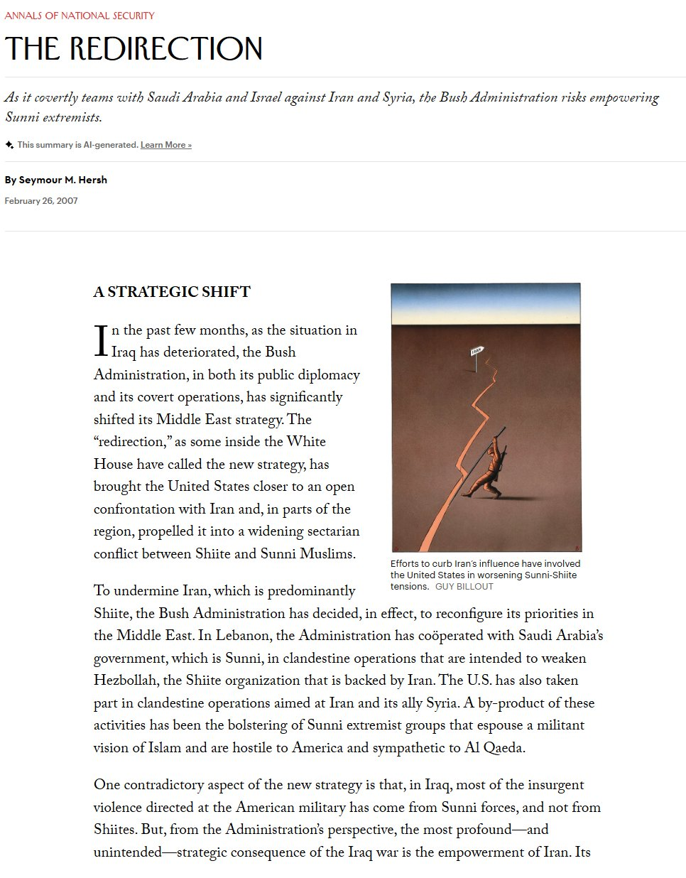 Strategię tę opisał zaraz po wojnie libańskiej Seymour Hersh w „New Yorkerze” w tekście „The Redirection” – czyli przekierowanie insurekcji z powrotem na jej „źródło”, czyli szyicki półksiężyc.